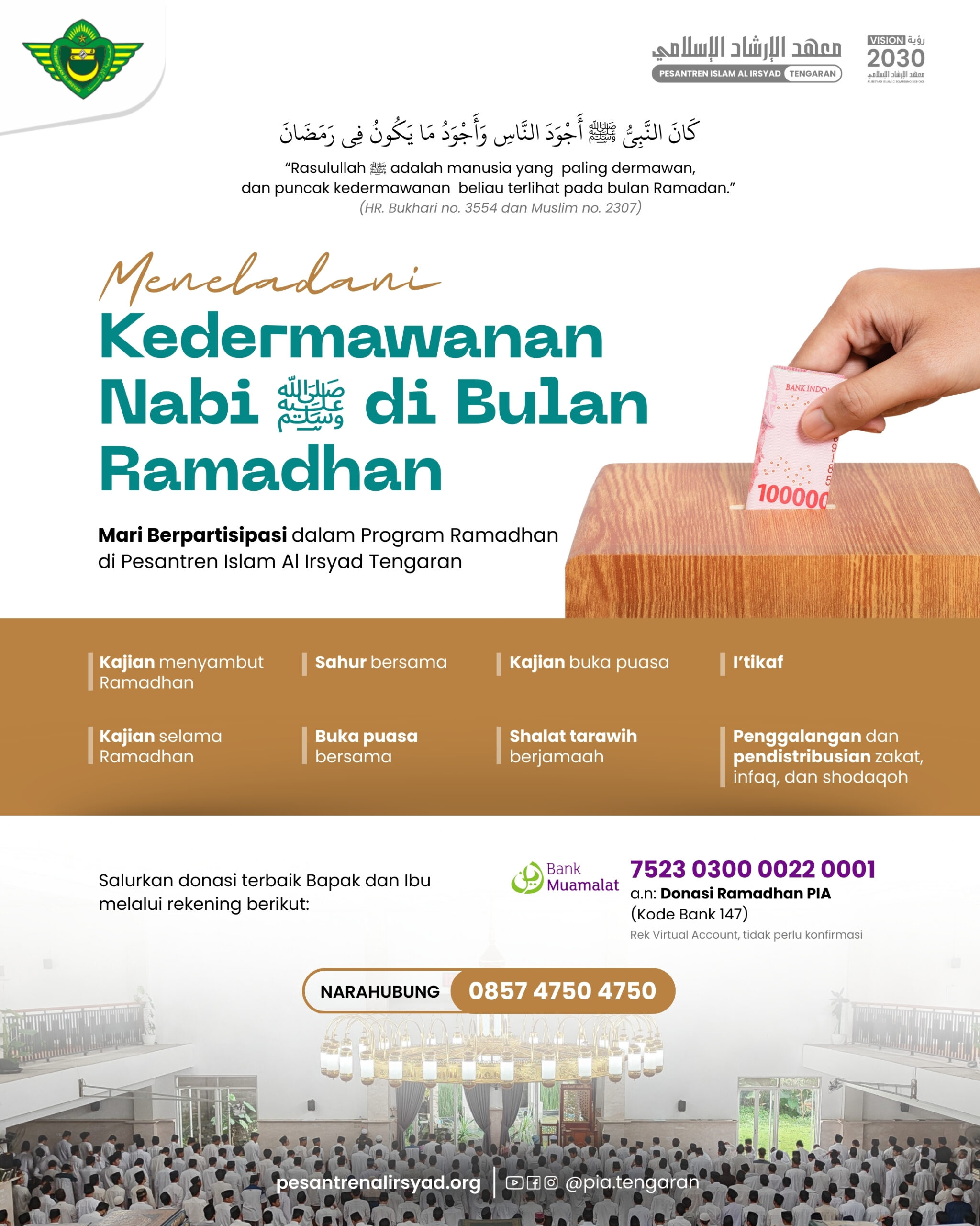 Bulan Ramadhan merupakan momentum istimewa untuk meningkatkan keimanan, memperbanyak amal shalih, serta menumbuhkan kepedulian sosial. Dalam rangka menyemarakkan dan menghidupkan bulan penuh berkah ini, Pesantren Islam Al Irsyad Tengaran mengajak Bapak dan Ibu untuk berpartisipasi dalam rangkaian Program Ramadhan.